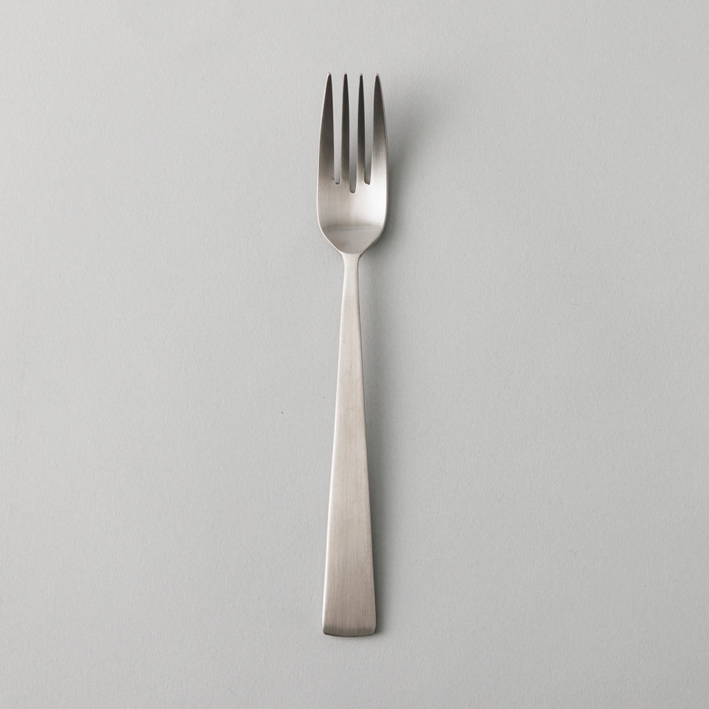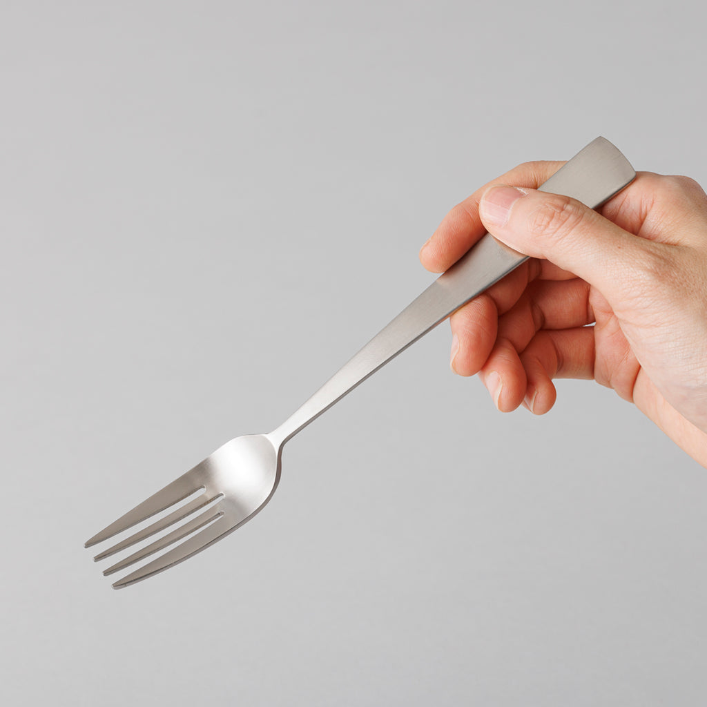 ヘアライン仕上げで、指紋や水垢などのお手入れも簡単にできるようにし、日常食生活にも気兼ねなく使えるカトラリー。