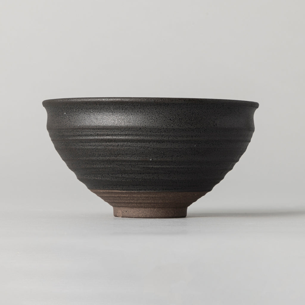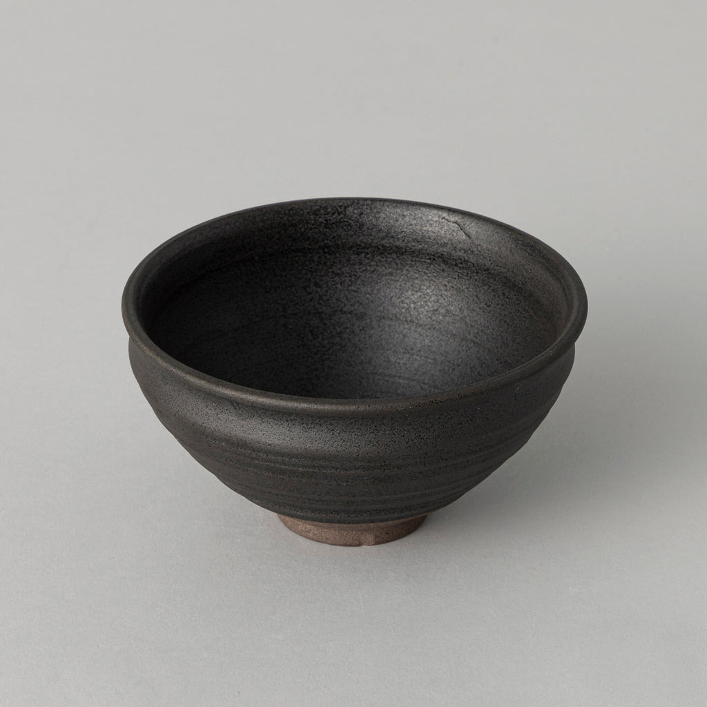 黒土の素材感を引き立てる黒結晶の釉薬をまとわせた、人気の京型抹茶碗。