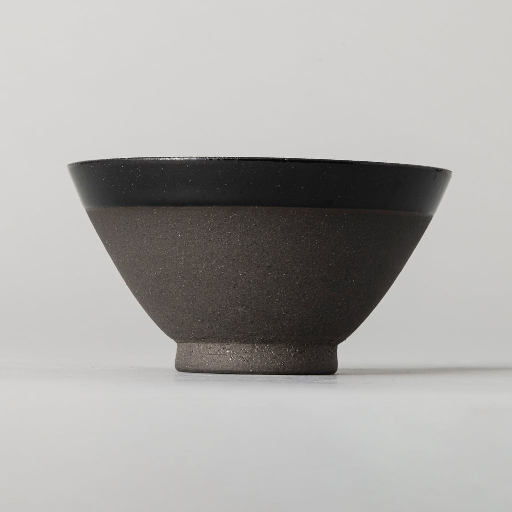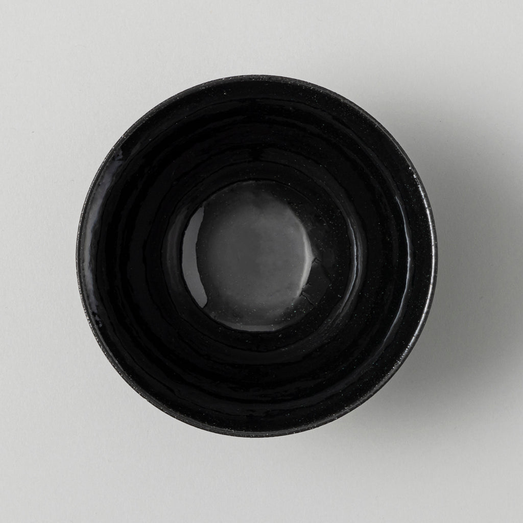 黒さにこだわった陶土に青く透き通るトルコ釉をかけることで、ツヤのある独特な深い黒を表現。あえて施釉は最低限の範囲におさえることで、黒い陶土の質感にも触れて楽しむことができる飯碗です。