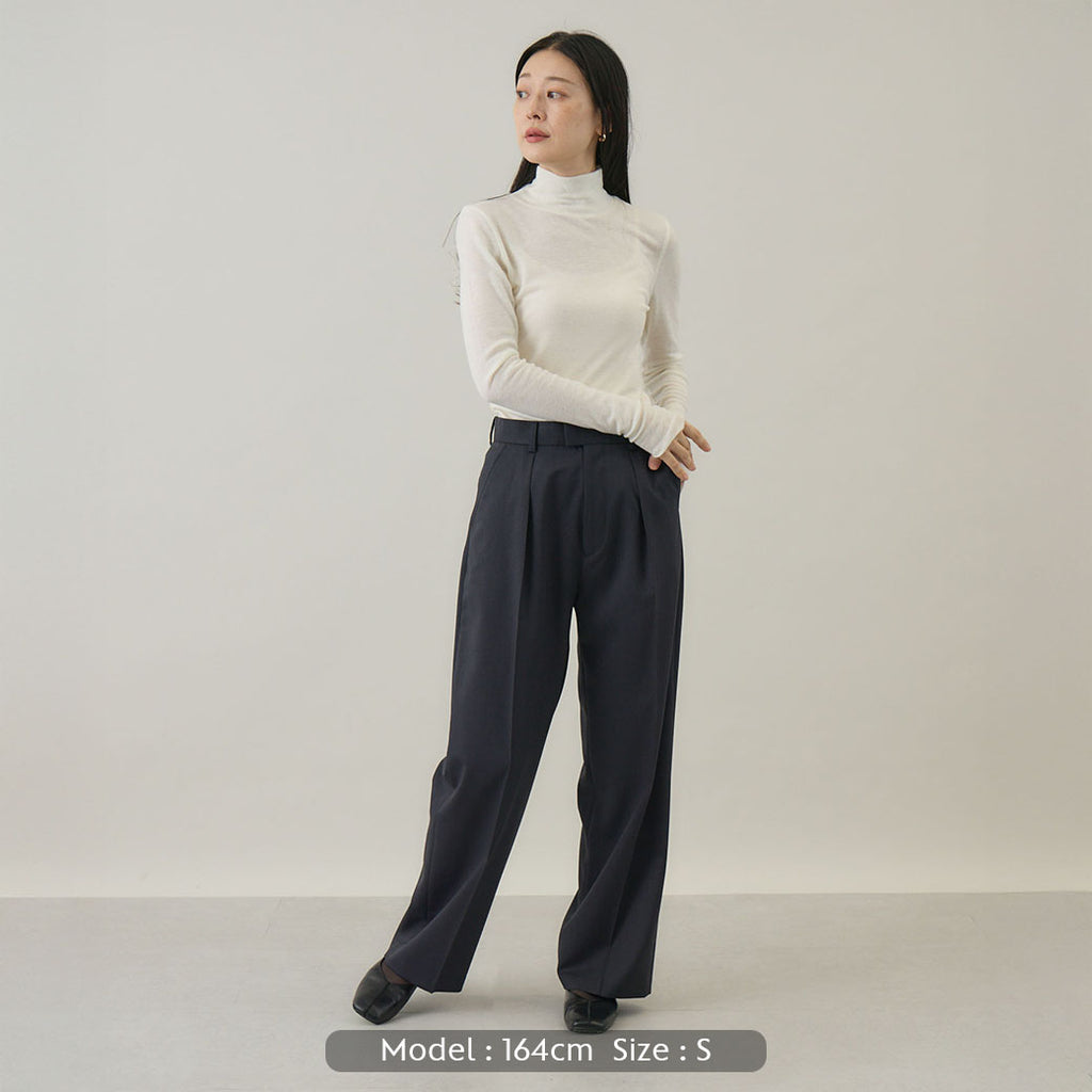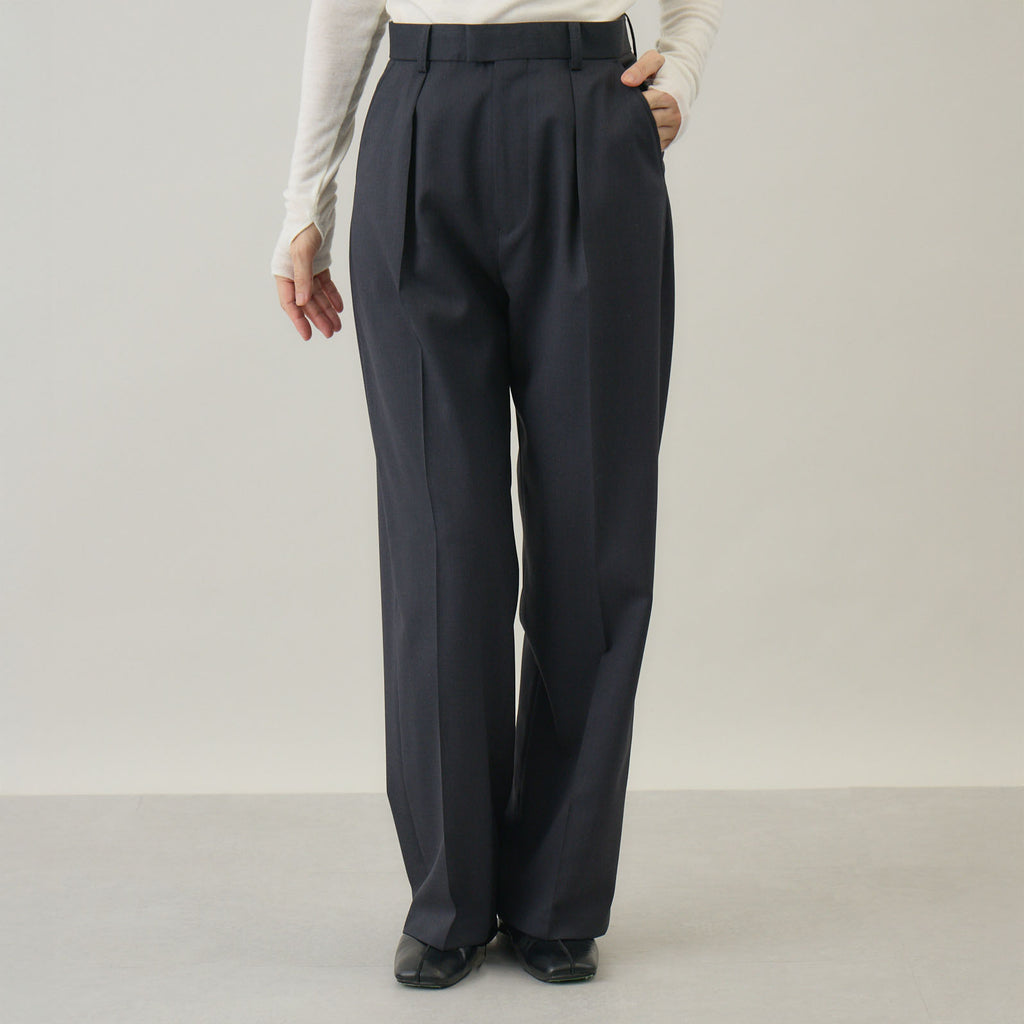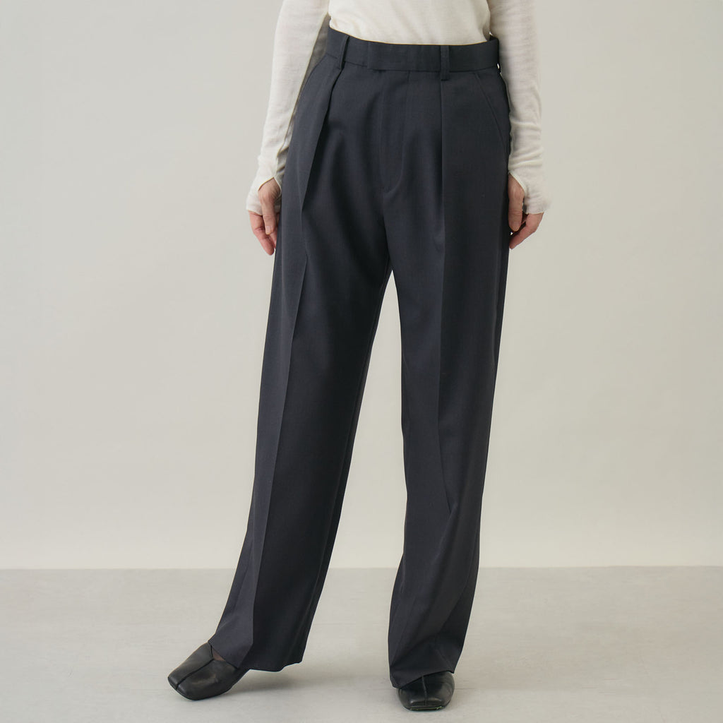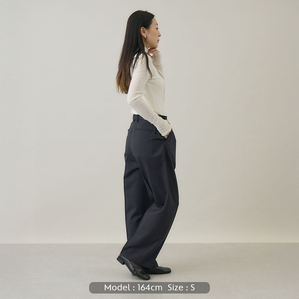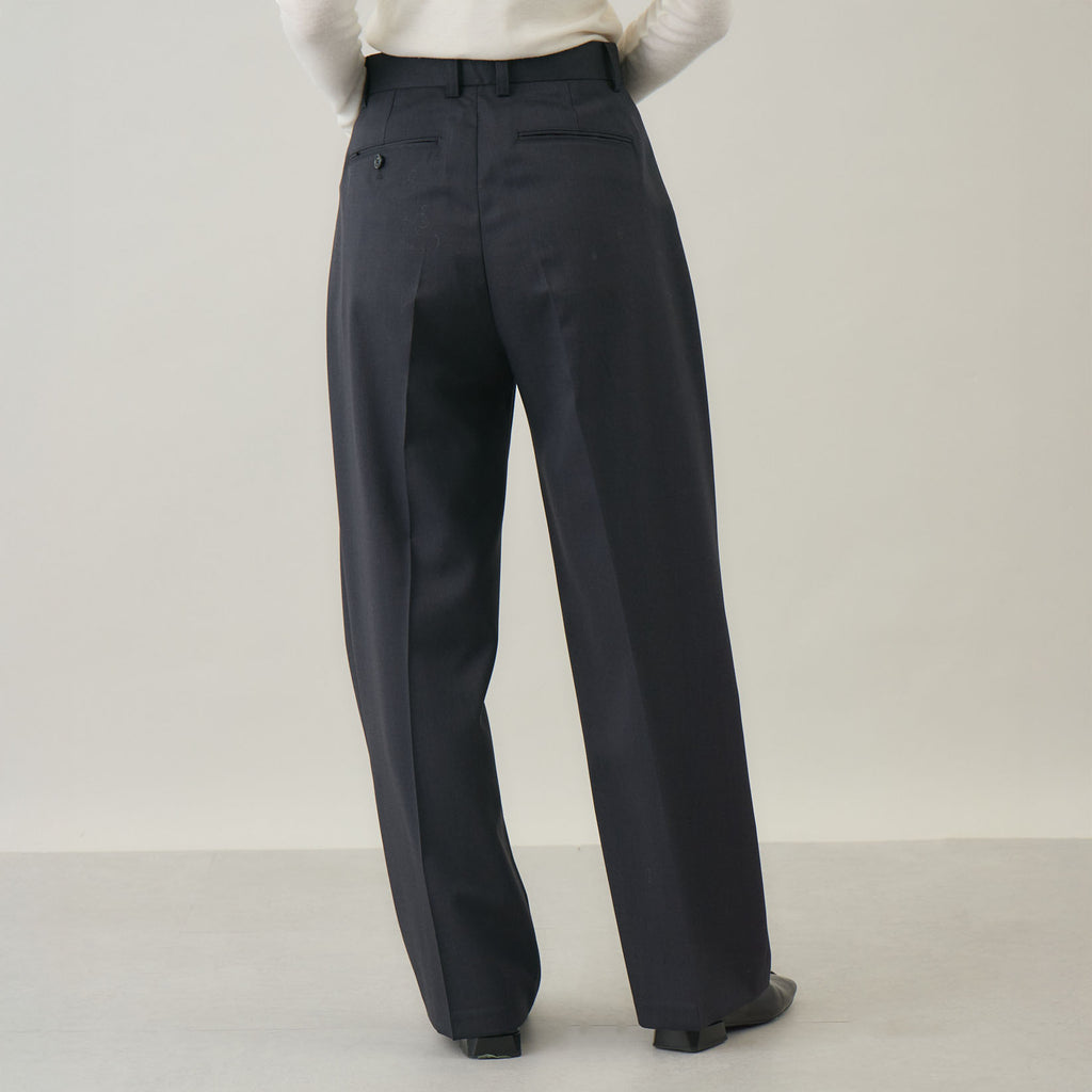 フロントタックで膨らみを持たせることで、美しい縦のラインを強調。腰回りに立体感を生みながらも、だらしなくならず、洗練されたワイドシルエットを描きます。