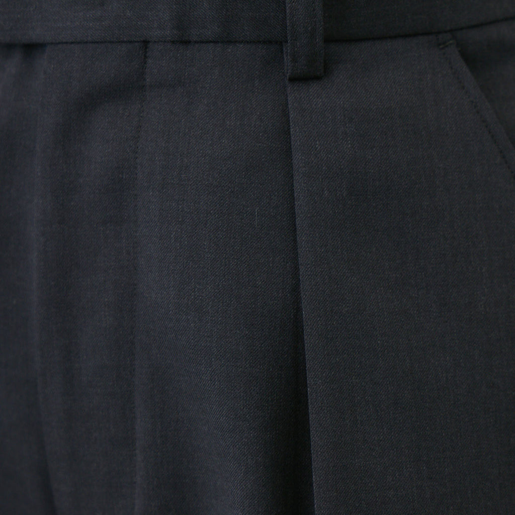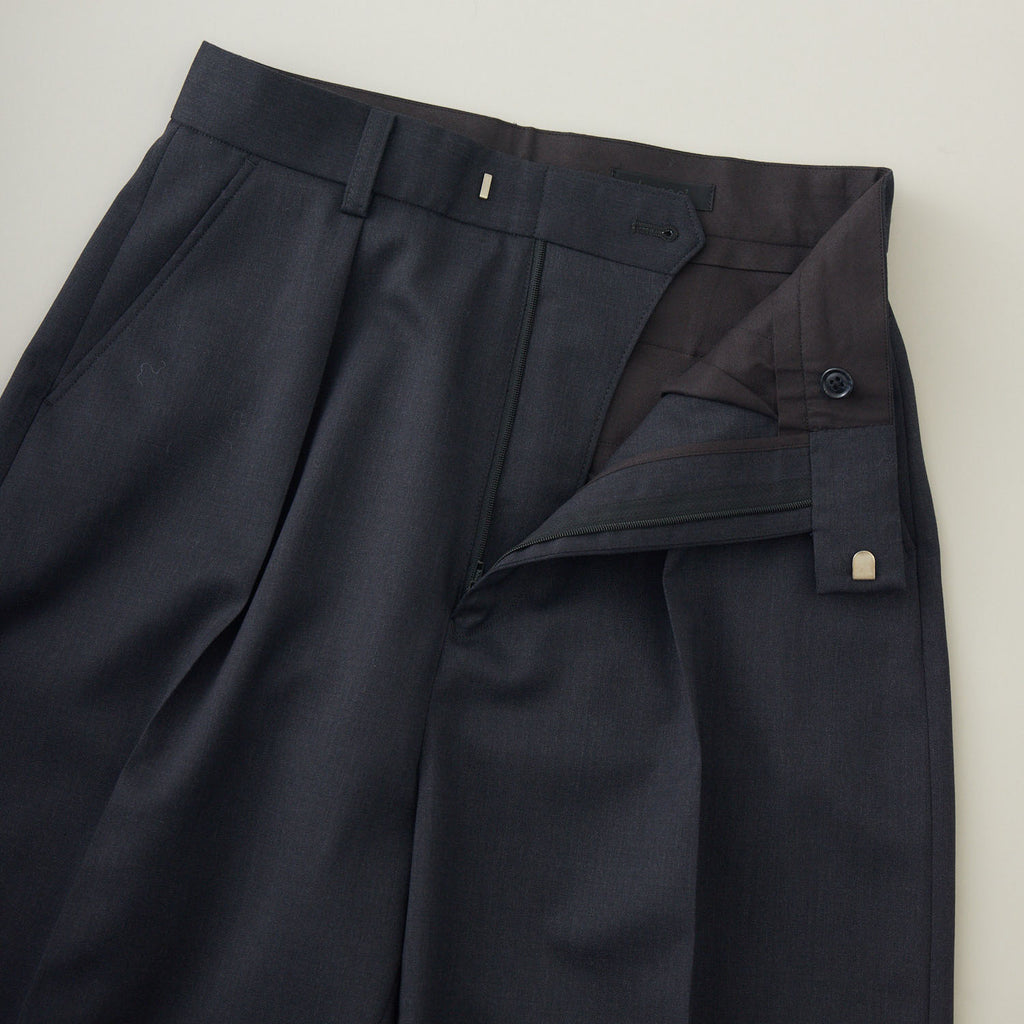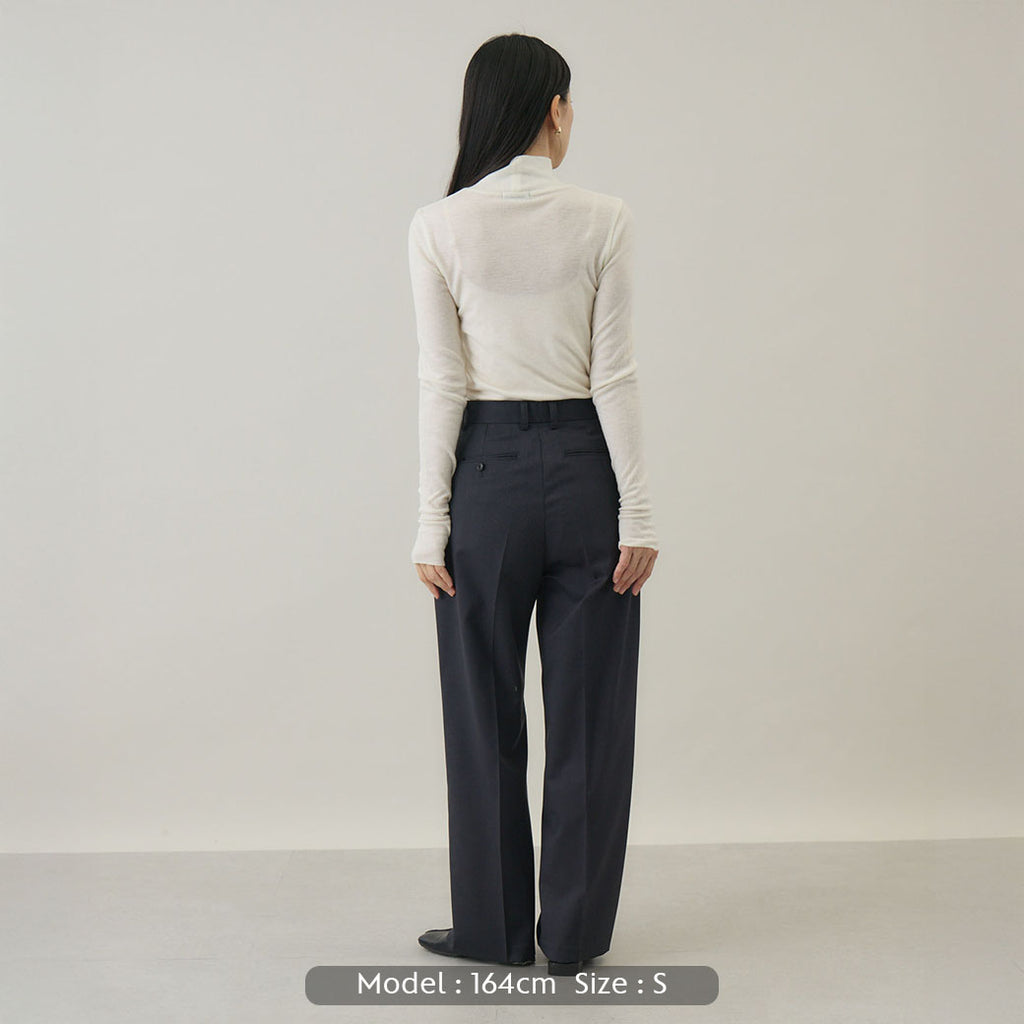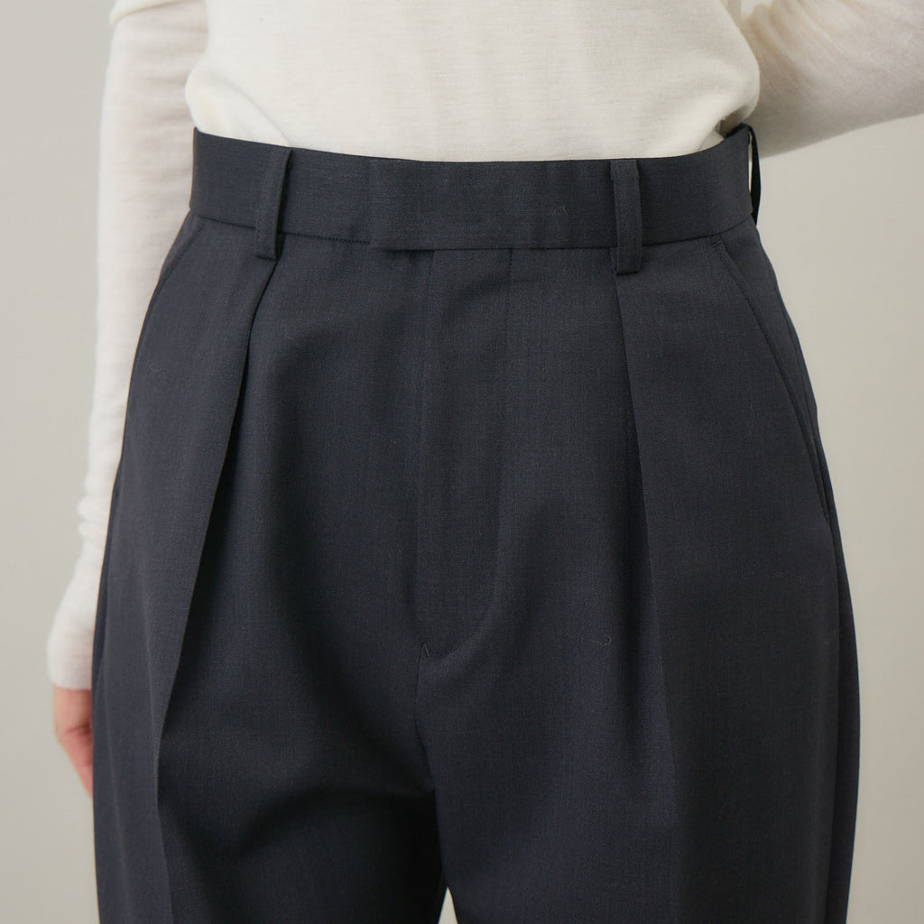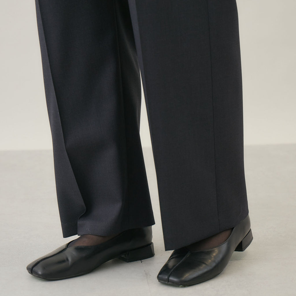 フロントタックで膨らみを持たせることで、美しい縦のラインを強調。腰回りに立体感を生みながらも、だらしなくならず、洗練されたワイドシルエットを描きます。