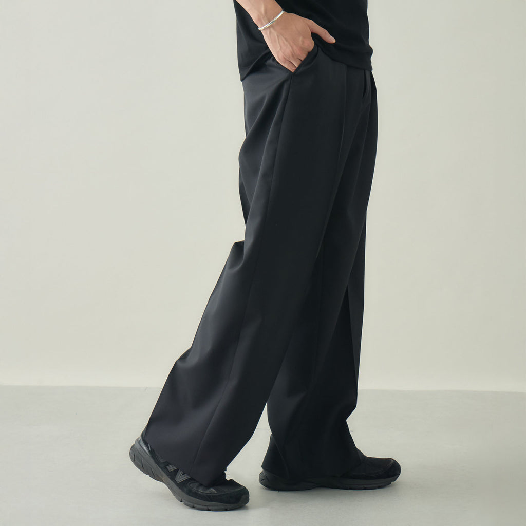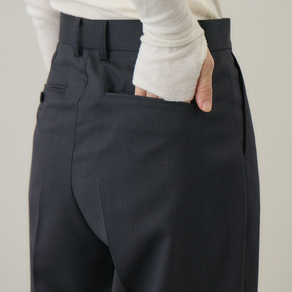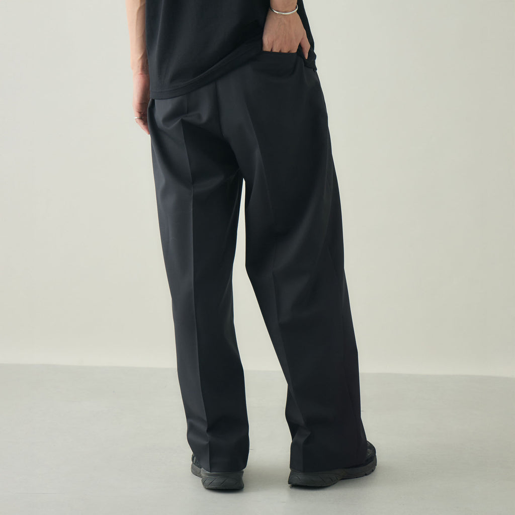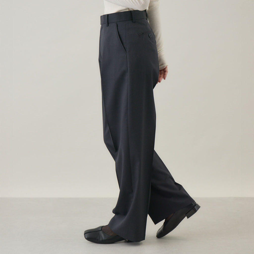 程よいゆとりのあるワイドスラックスは、ボリュームのあるトップスからコンパクトなシャツまで自在にマッチ。フォーマルにもカジュアルにも取り入れやすく、シーンを問わず活躍する一本です。日常に溶け込みながらも、確かな品格を持つ定番パンツです。