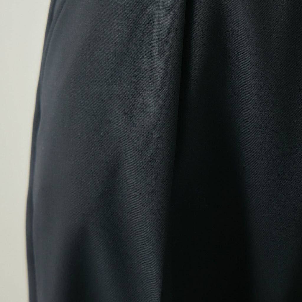 タテ・ヨコともに2/72という極細番手の梳毛(そもう)ウールを使用。繊細でなめらかな表面感と、素材本来の自然なふくらみが特徴です。光を柔らかく反射する艶やかな質感が、装いにワンランク上の気品を添えてくれます。
