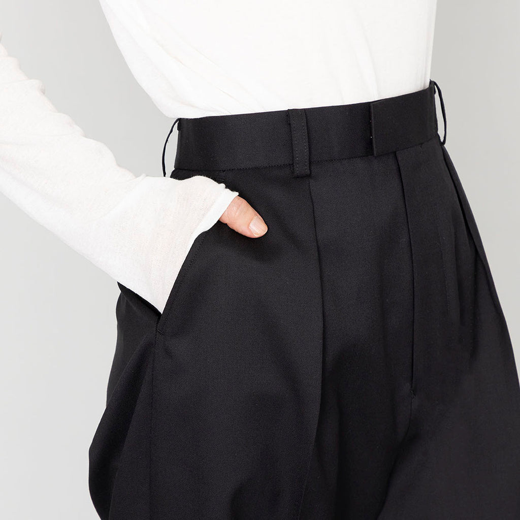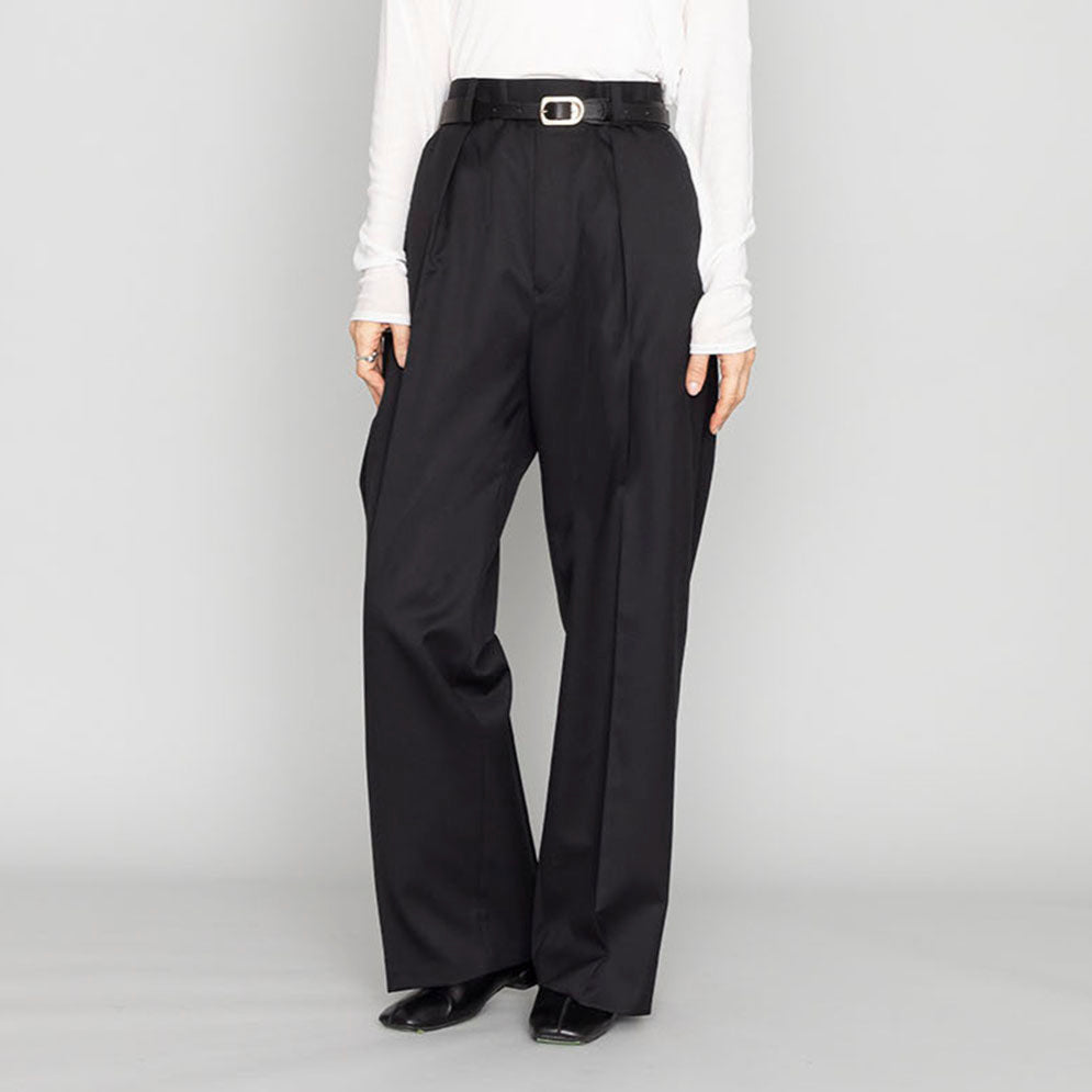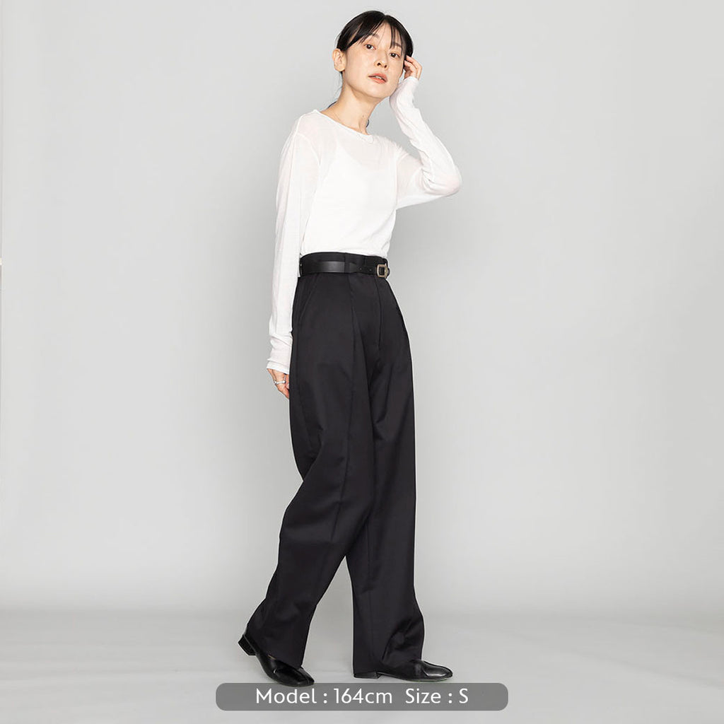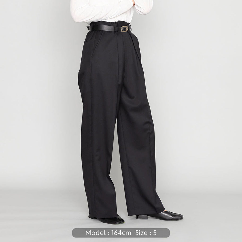 フロントタックで膨らみを持たせることで、美しい縦のラインを強調。腰回りに立体感を生みながらも、だらしなくならず、洗練されたワイドシルエットを描きます。