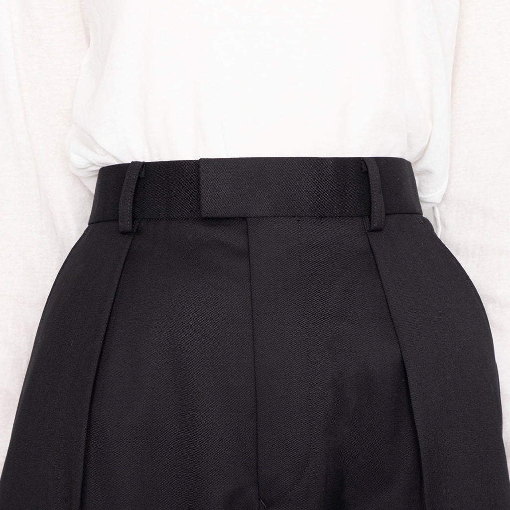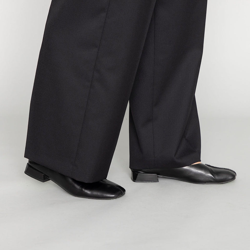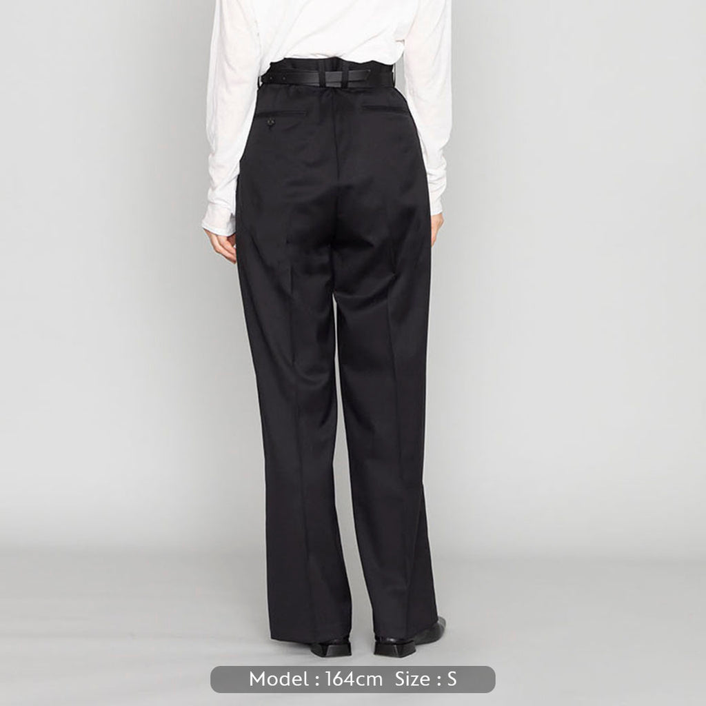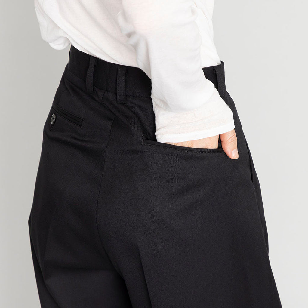 フロントタックで膨らみを持たせることで、美しい縦のラインを強調。腰回りに立体感を生みながらも、だらしなくならず、洗練されたワイドシルエットを描きます。