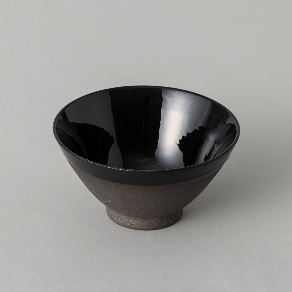 黒さにこだわった陶土に青く透き通るトルコ釉をかけることで、ツヤのある独特な深い黒を表現。あえて施釉は最低限の範囲におさえることで、黒い陶土の質感にも触れて楽しむことができる飯碗です。