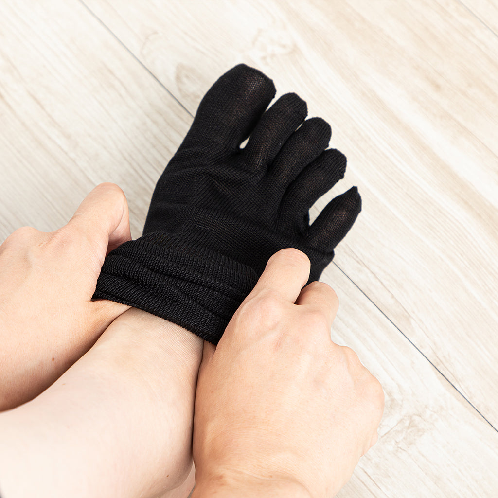 なめらかなシルクが肌にたっぷりと触れるようつま先から履き口まで46㎝ある長め設計のシルク5本指靴下。