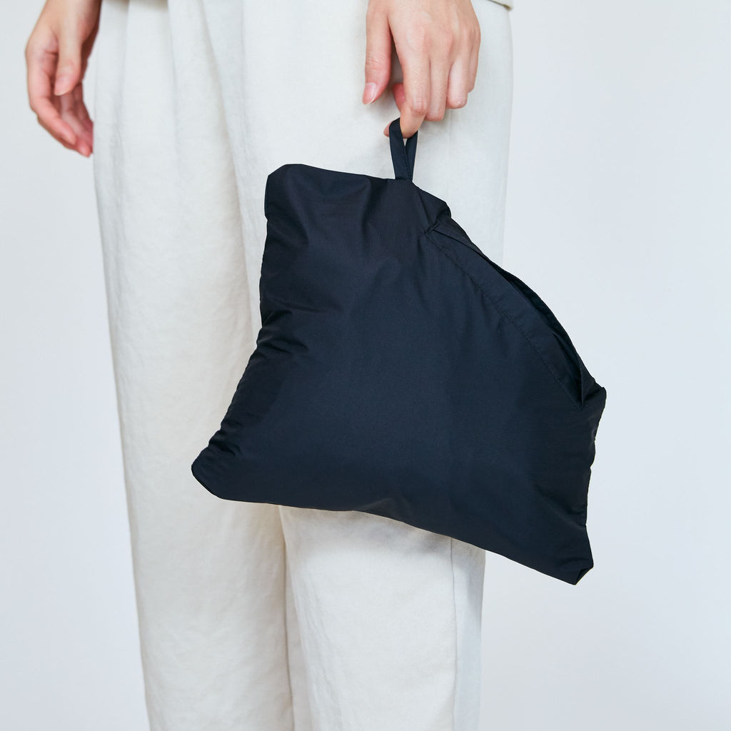 左右のハンドポケットにはスナップボタン付き。使用後は左ポケットに本体を収納できるパッカブル仕様で、バッグにコンパクトに収まります。