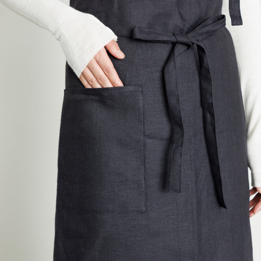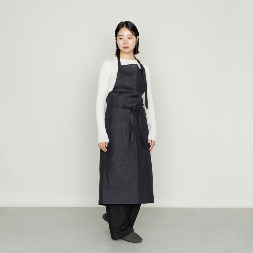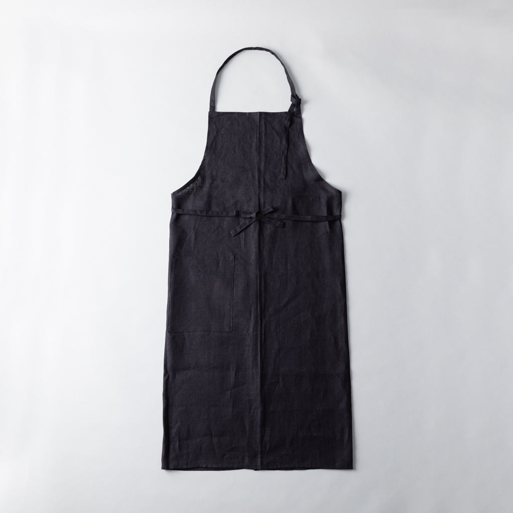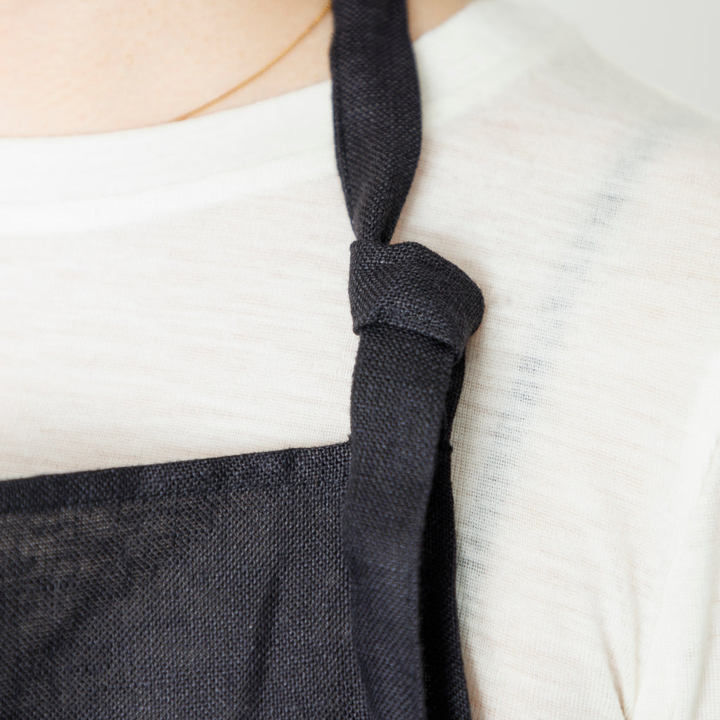 シックなブラックリネンのフルエプロン。上質なリネン布で作られているので、落ち着いた艶感があり、無地でも上品さとかっこよさを兼ね備えています。キッチンやDIY、ガーデニングなど様々な場所でお使いいただけるよう、少し太めのリネン糸を使用し軽くても丈夫さをUPさせました。ブラックは身につけると、装いを引き締め、着るものを選ばずお使いいただけます。洗いざらしのシワ感も楽しめるエプロンです。