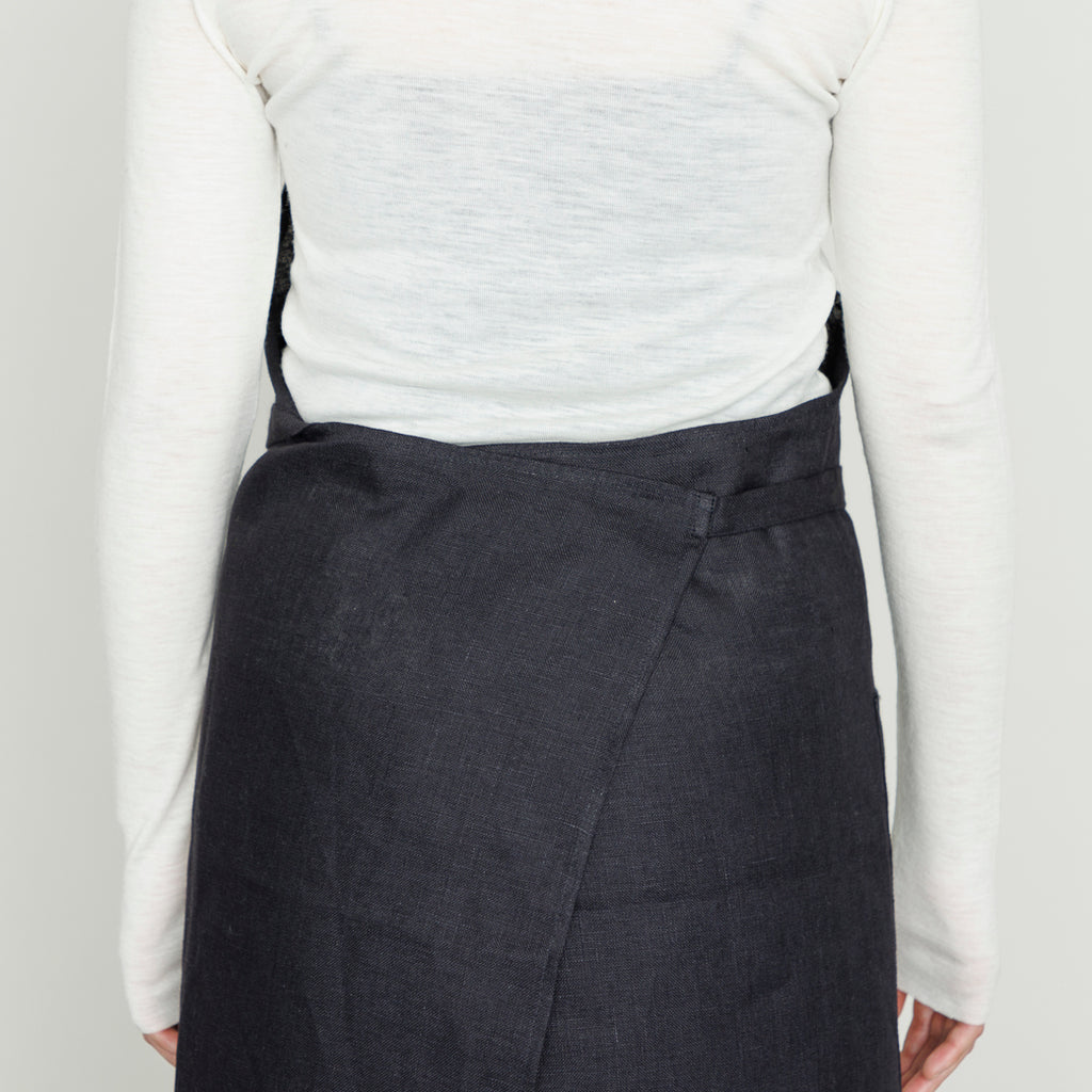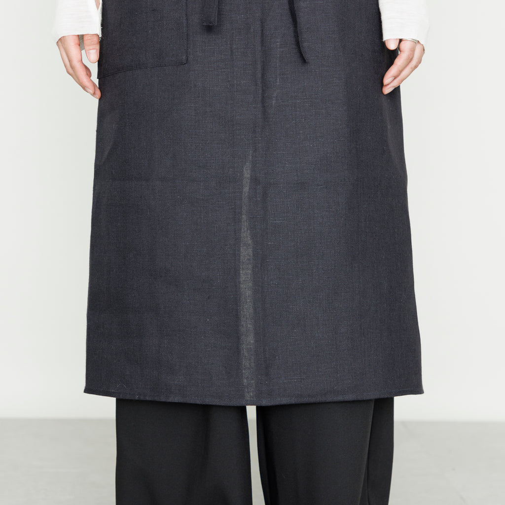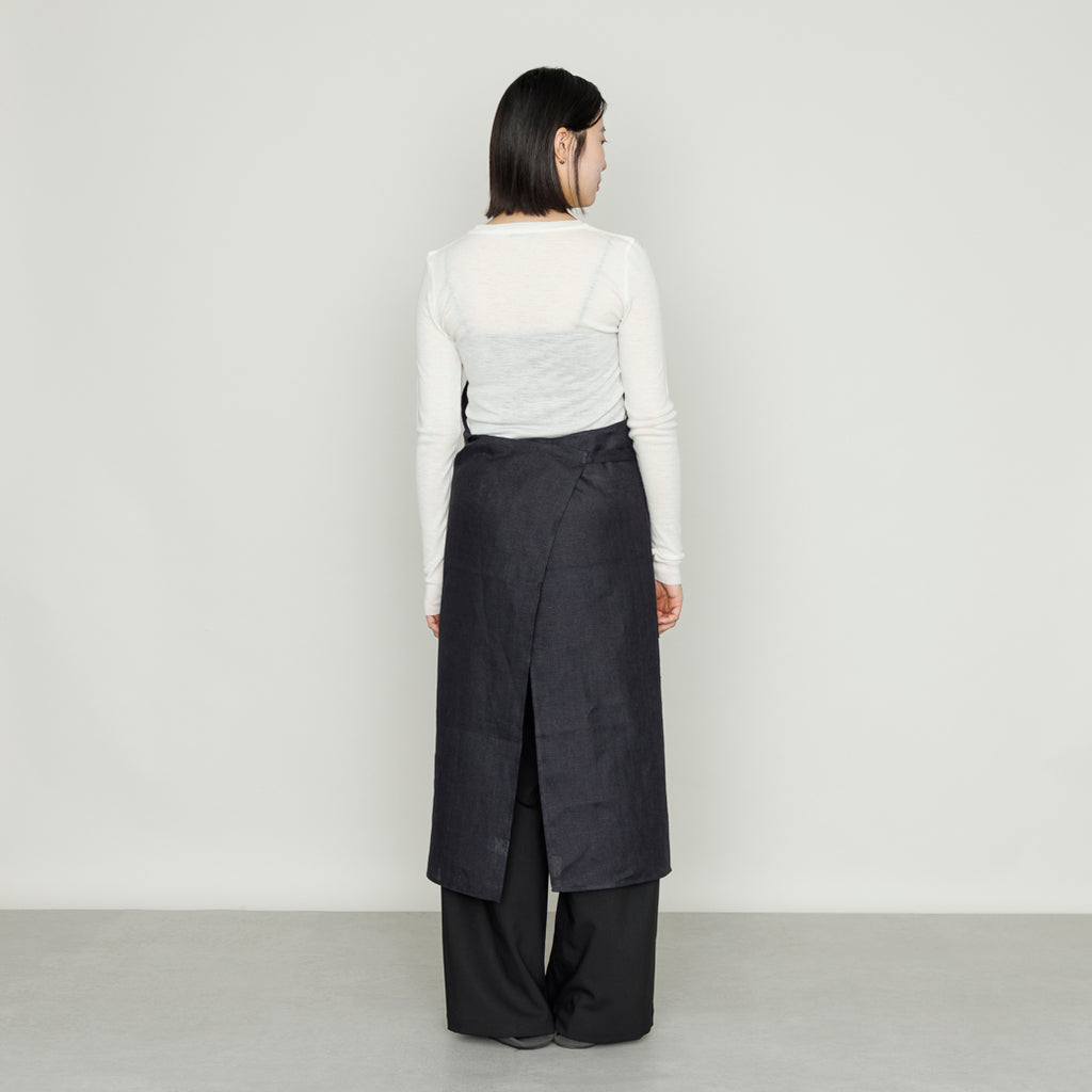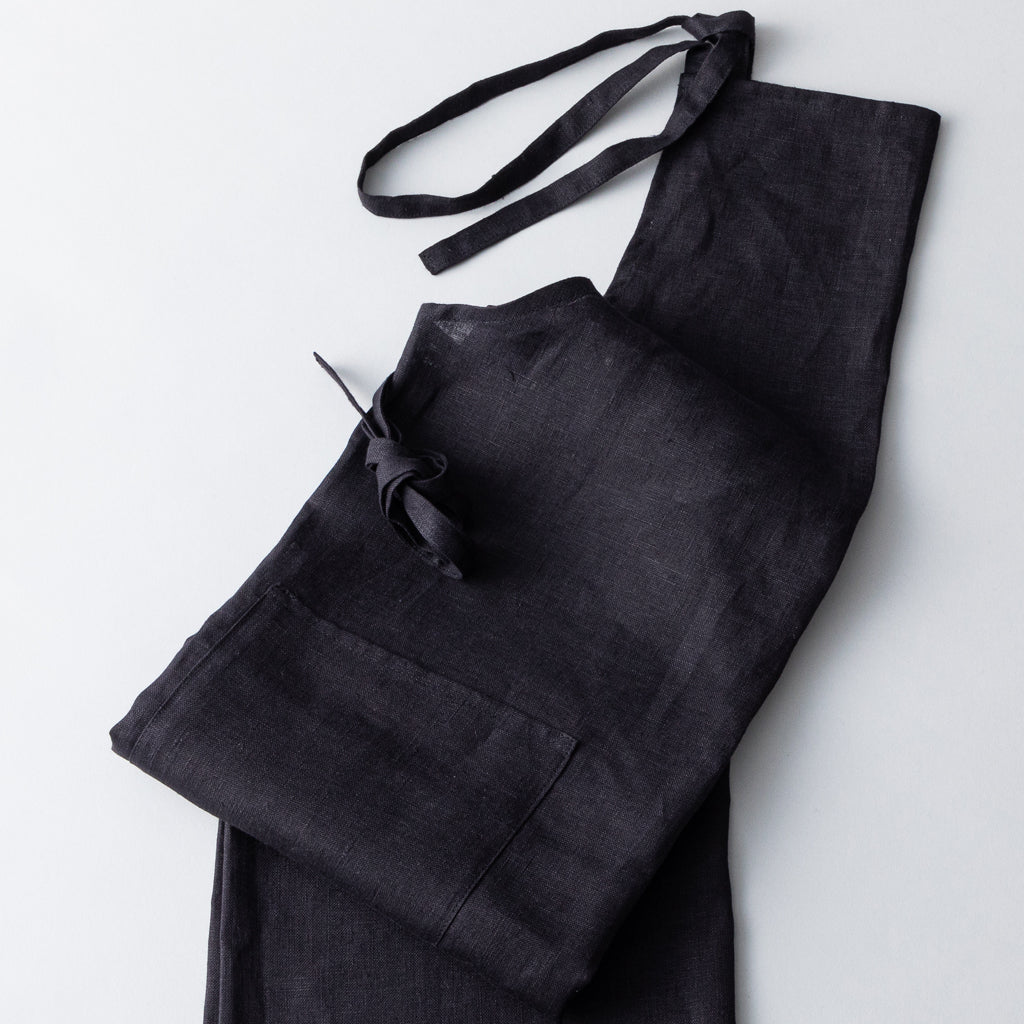 シックなブラックリネンのフルエプロン。上質なリネン布で作られているので、落ち着いた艶感があり、無地でも上品さとかっこよさを兼ね備えています。キッチンやDIY、ガーデニングなど様々な場所でお使いいただけるよう、少し太めのリネン糸を使用し軽くても丈夫さをUPさせました。ブラックは身につけると、装いを引き締め、着るものを選ばずお使いいただけます。洗いざらしのシワ感も楽しめるエプロンです。