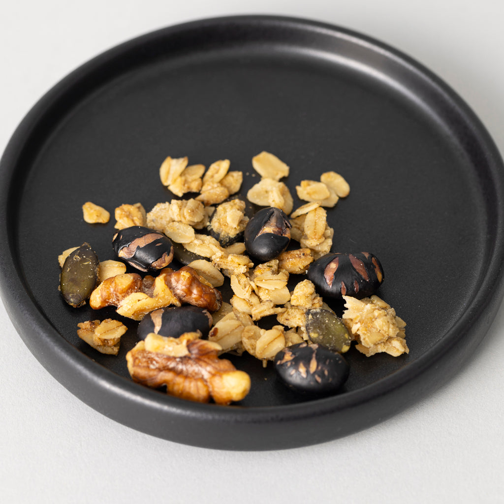 和のエッセンスを取り入れた新感覚グラノーラ。昆布のうまみと、黒大豆・黒胡椒の味わいが調和します。ちょっとしょっぱいサレな風味はおやつにはもちろん、お酒のおつまみとしてもおすすめです。