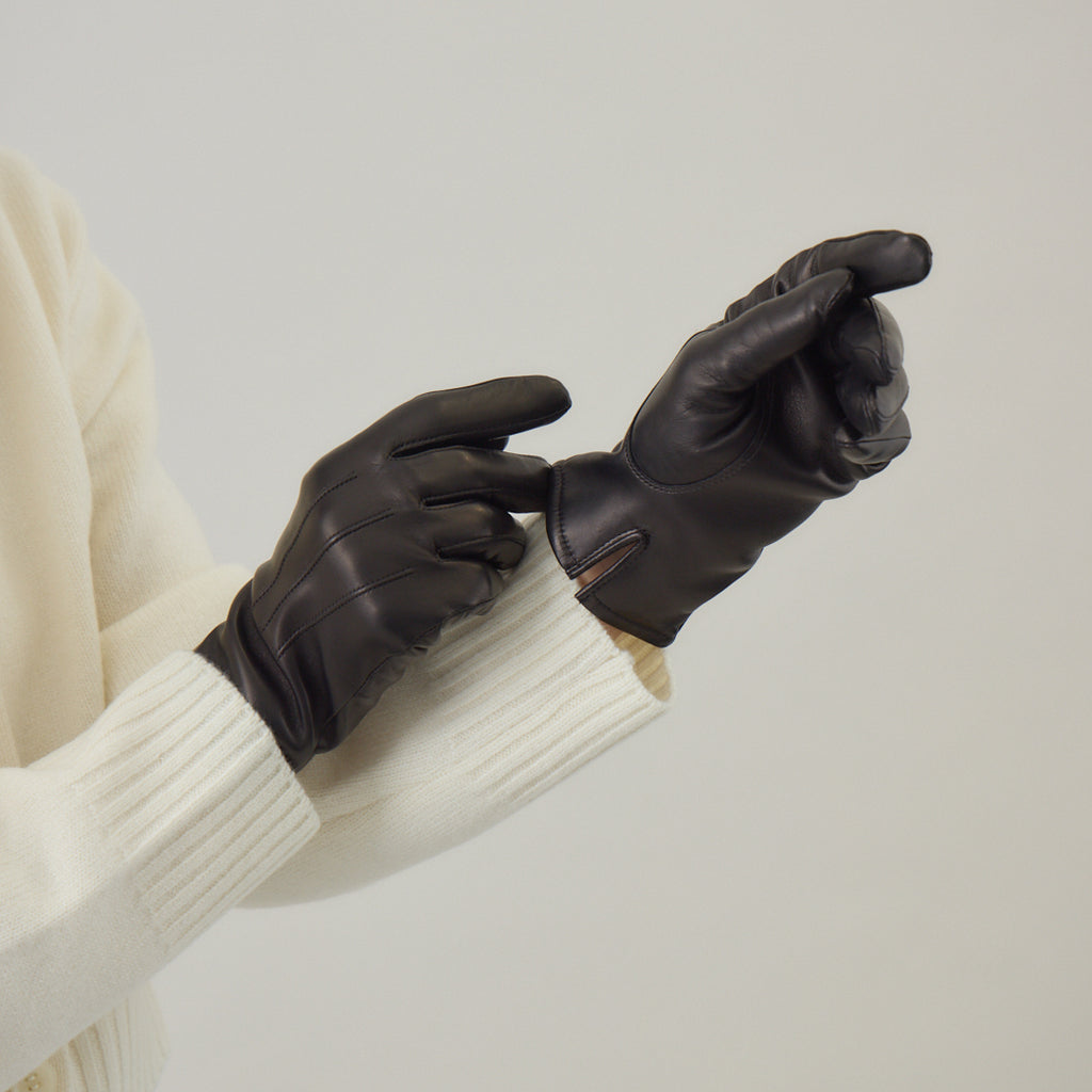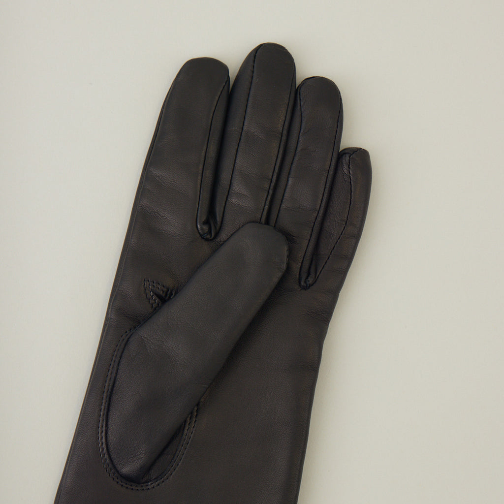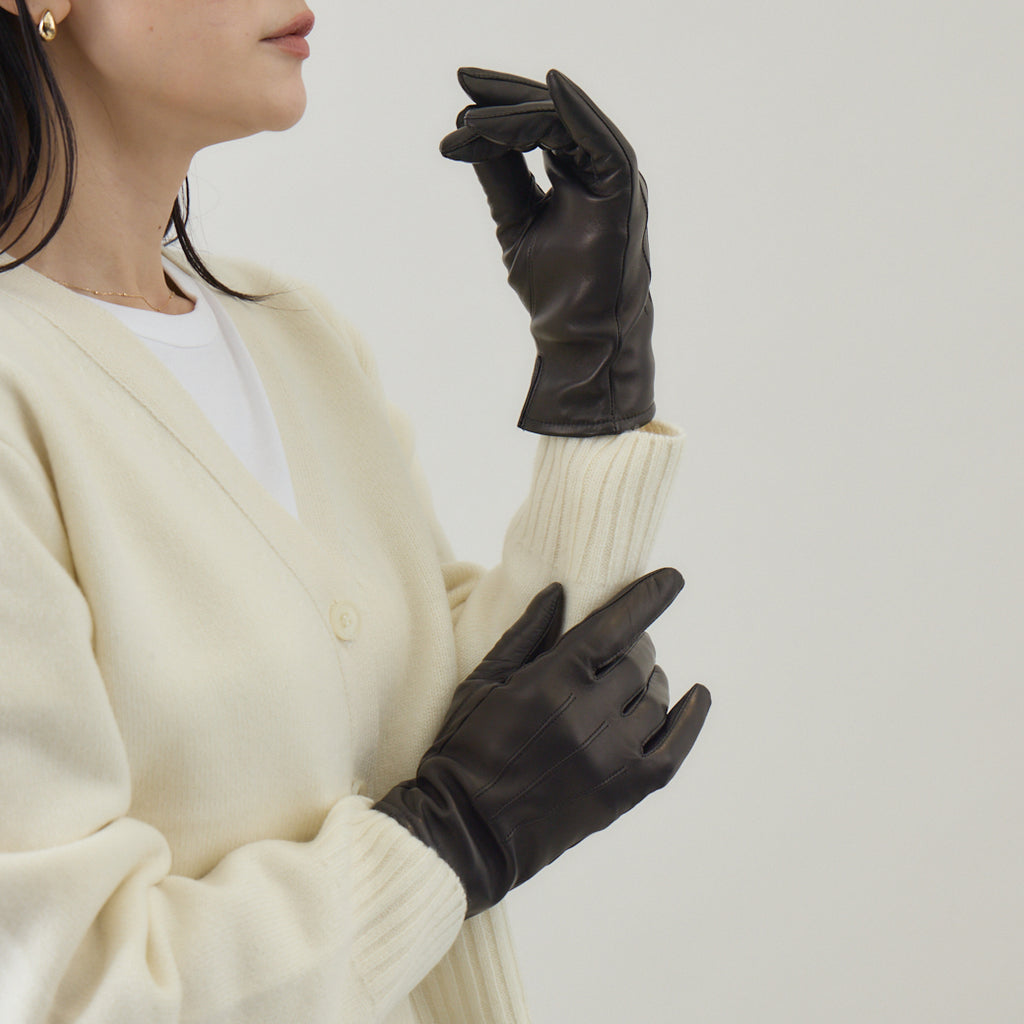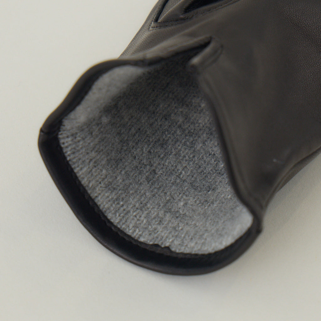 ふんわりと柔らかなイタリーラムを表地に、しっとりとなめらかなカシミヤ100%を裏地に使用。手に吸いつくようなラムレザーの質感と、軽くてあたたかなカシミヤのぬくもりが融合し、上質な心地よさを叶えました。素材のやわらかさと上品さを兼ね備えた、贅沢な仕上がりです。