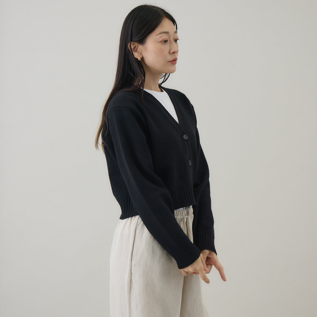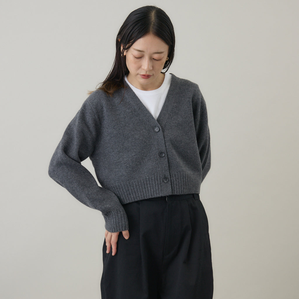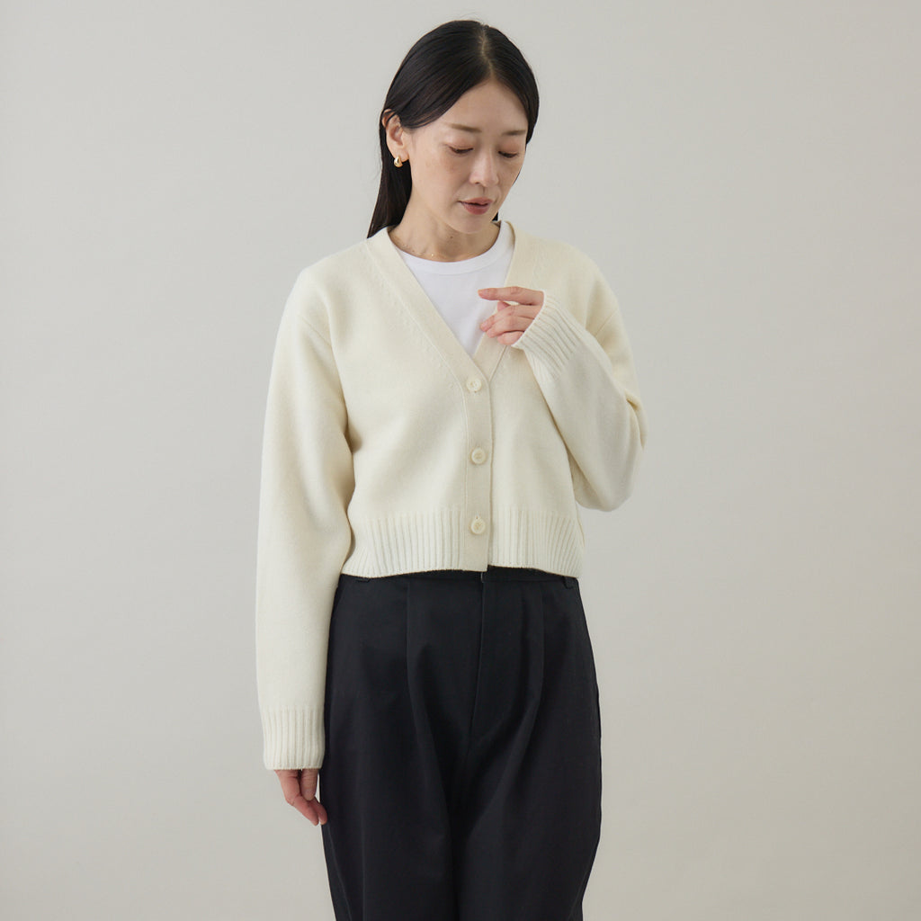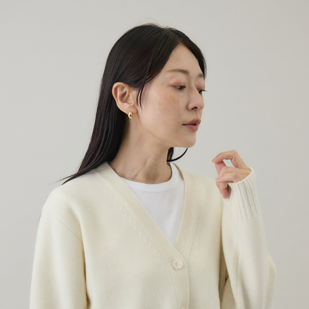 ボトムスと合わせやすいコンパクト丈着丈を短めに設定したカーディガンは、トレンド感を意識しつつ⾒た⽬が若くなりすぎないように仕上げられています。前開きのカーディガンは汎⽤性が⾼いこともポイントで、インナーはブラウス、カットソー等アイテムを選びません。また室内では肩から⽻織るようにすることも意識して作られているため、素材⾃体に軽さや暖かさがあることが汎⽤性の⾼さを引き出します。