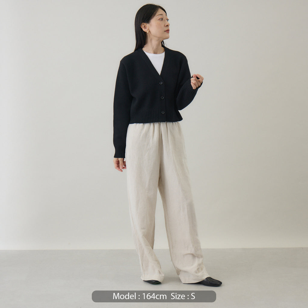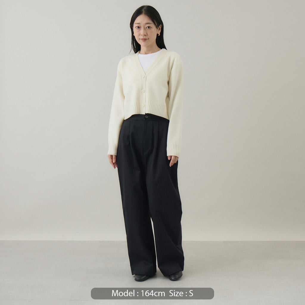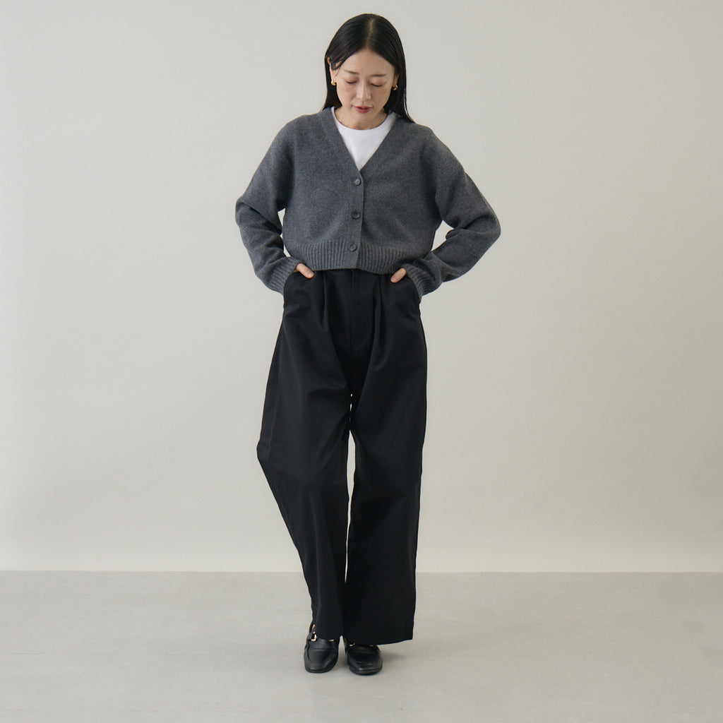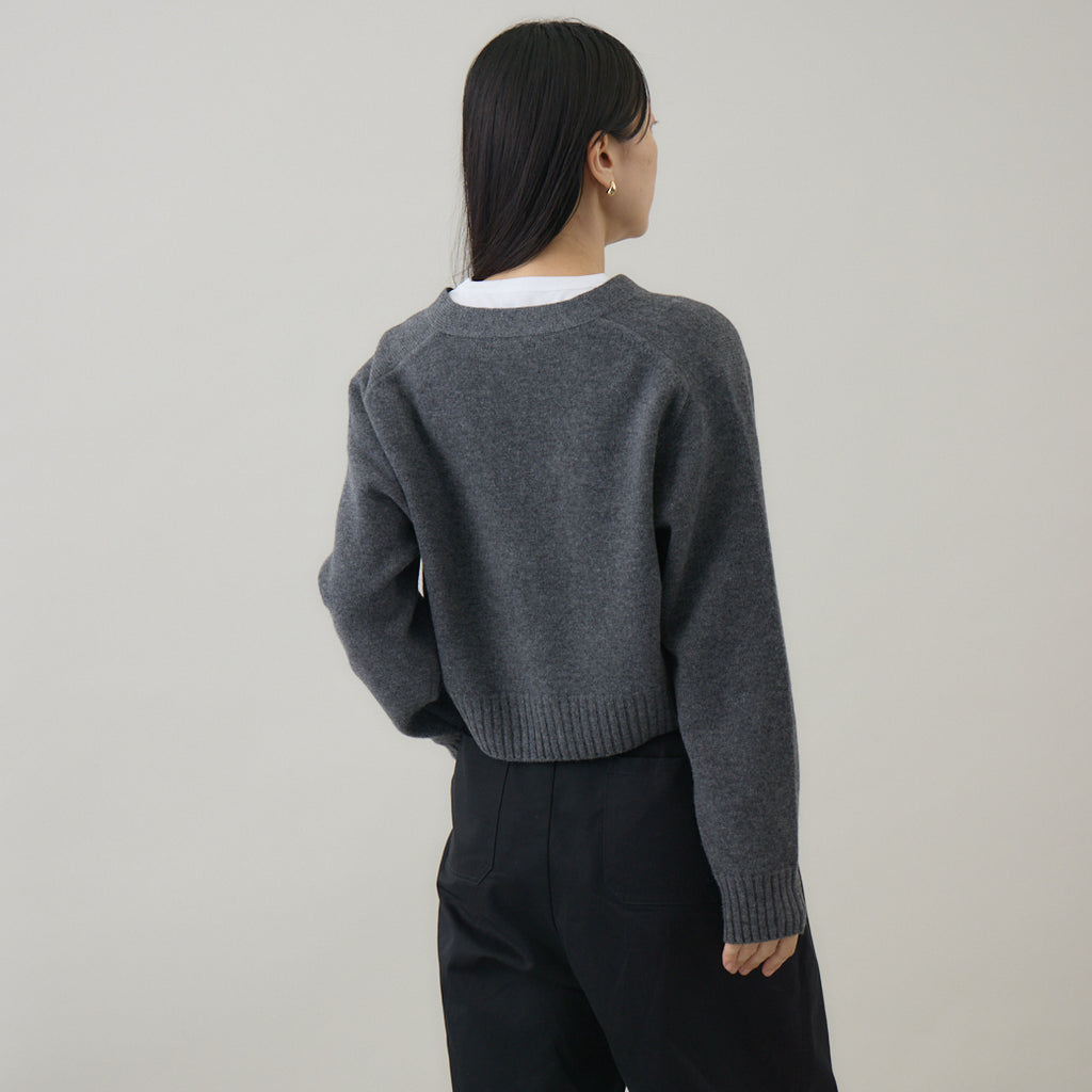 ボトムスと合わせやすいコンパクト丈着丈を短めに設定したカーディガンは、トレンド感を意識しつつ⾒た⽬が若くなりすぎないように仕上げられています。前開きのカーディガンは汎⽤性が⾼いこともポイントで、インナーはブラウス、カットソー等アイテムを選びません。また室内では肩から⽻織るようにすることも意識して作られているため、素材⾃体に軽さや暖かさがあることが汎⽤性の⾼さを引き出します。
