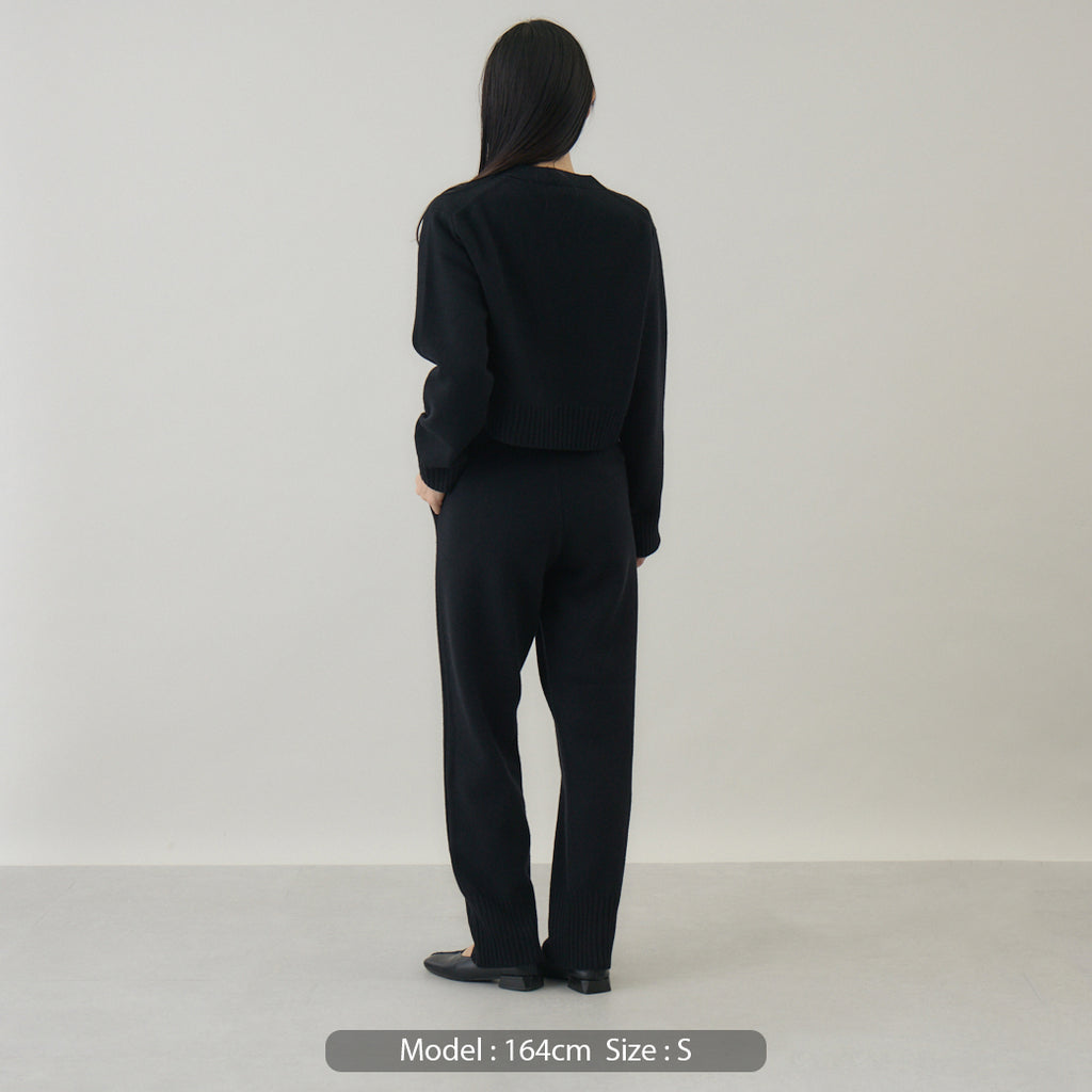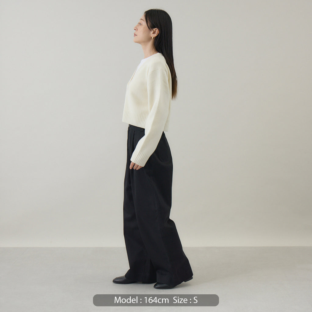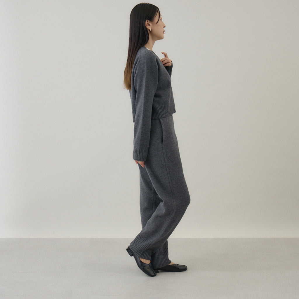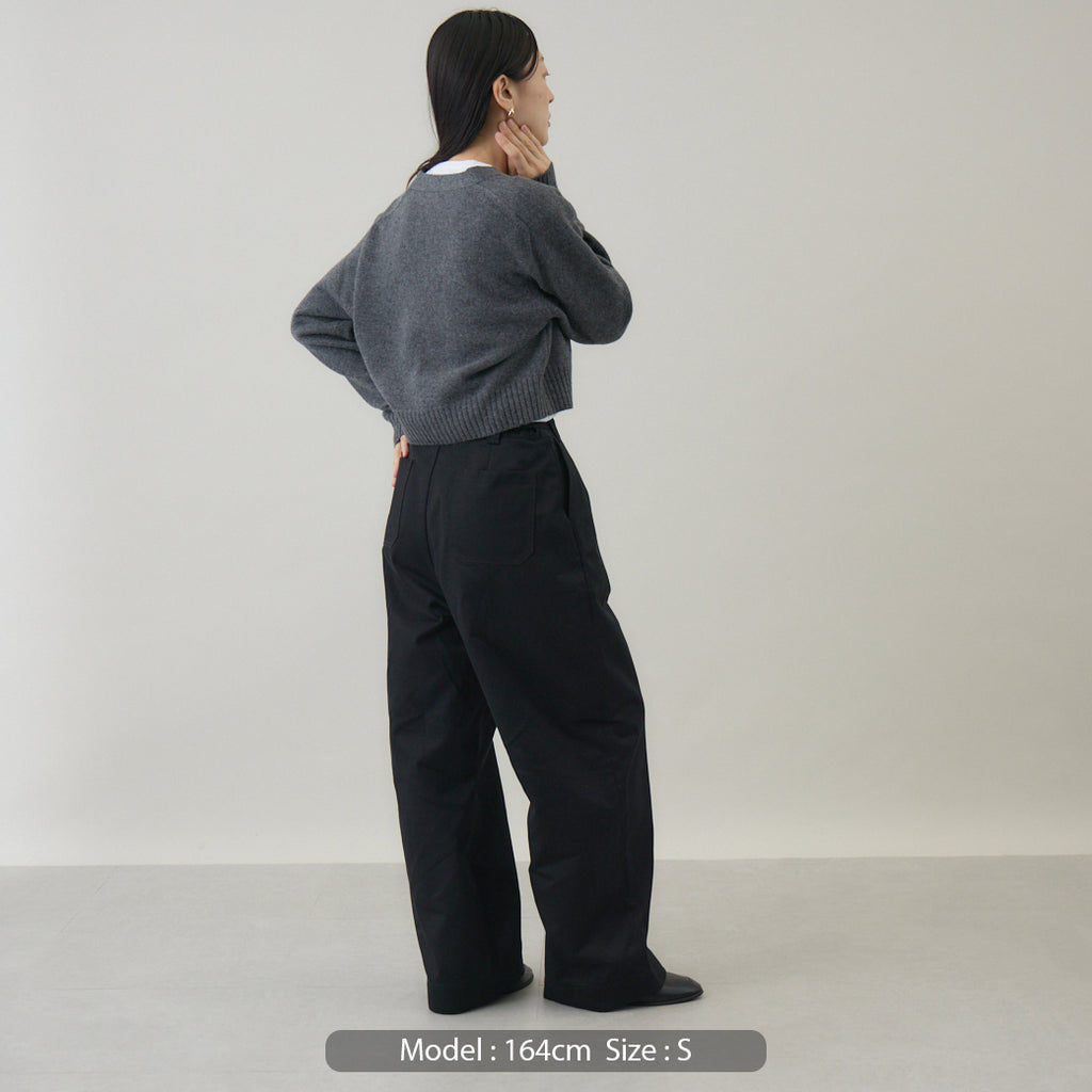 ボトムスと合わせやすいコンパクト丈着丈を短めに設定したカーディガンは、トレンド感を意識しつつ⾒た⽬が若くなりすぎないように仕上げられています。前開きのカーディガンは汎⽤性が⾼いこともポイントで、インナーはブラウス、カットソー等アイテムを選びません。また室内では肩から⽻織るようにすることも意識して作られているため、素材⾃体に軽さや暖かさがあることが汎⽤性の⾼さを引き出します。